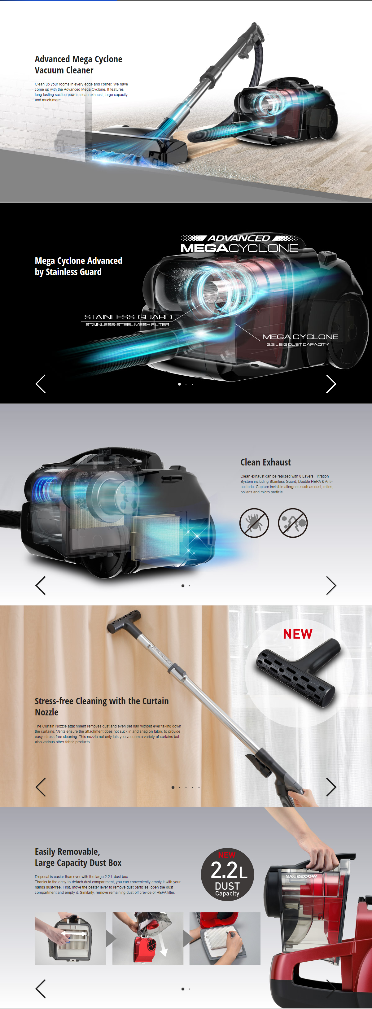 Input Power 1600 W HEPA Filter Plastic Extension Wand x 2 50 m Cord Length. Allergens cause allergies irritated skin congestion itchy eyes and lack of sleep if not regularly sanitized. Outstanding suction power 200W Twisting nozzle enables convenient usage.